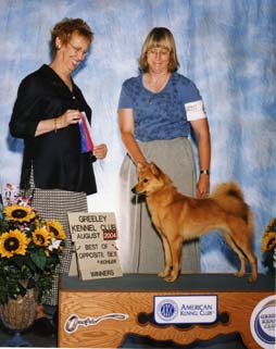 I have included a few pictures. Two of Harakka last weekend. She won Winners Female and Best of Opposite Sex both days, beating two much older girls. This earned her 2 points each day for a total of four, her first points. I will send you a copy of her picture from the show when we get it. The other picture is a professional one of Nicc that I plan to use one day in an advertisement for him. Just some pictures for your enjoyment. I am very proud of Ruuti, and hope she is doing well. Thank you for making such a nice webpage for the girls!! Leslie What can we say? Congratulations!!! This is a really good start for the Hot Nickel litter - I bet there is a proud "Papa" too nearby.
