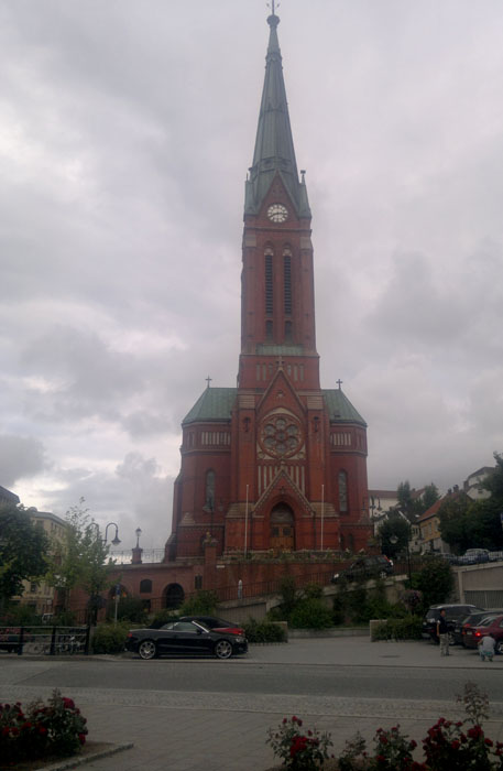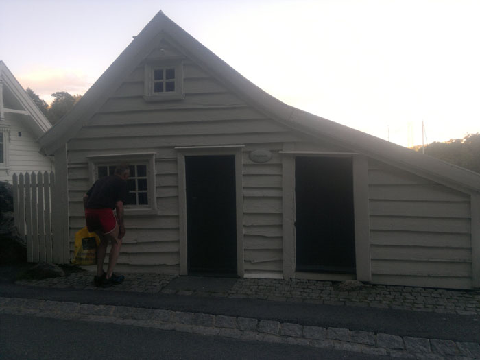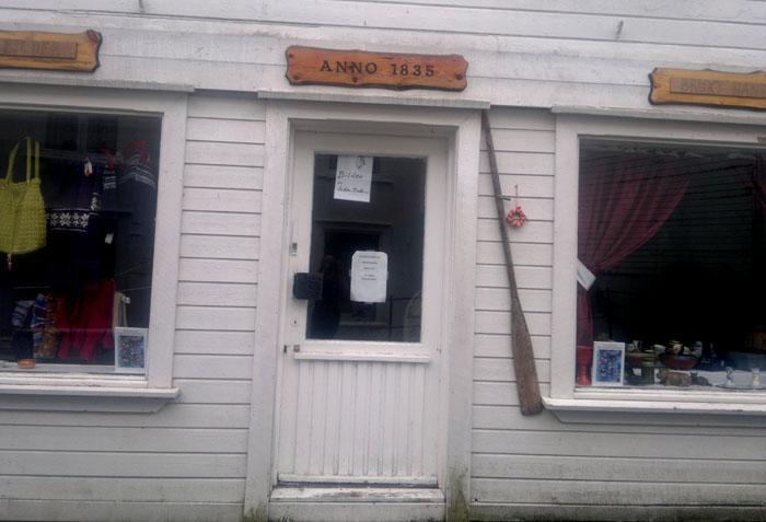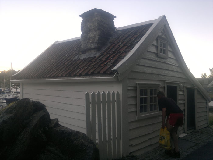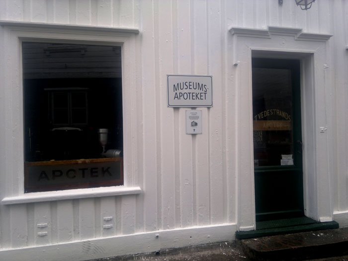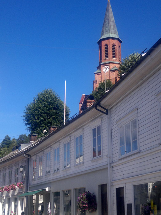 Myös Tvedestrandissa on punatiilikirkko. Se ei kuitenkaan ollut kävelytiemme varrella, joten näimme siitä vain korkean kellotornin. Tvedestrandin ranta on vanhaa puutaloaluetta. Kujat ovat kapeita, joskus jyrkkiäkin. Rantakaistaleella puutaloissa on nykyään putiikkeja, kampaamoja, kalakauppa, vanhaintavaroiden kauppoja, apteekkimuseo. Merkittävä piirre oli kirjakauppojen runsaus. Hauska ajatus oli myydä kirjoja ympäri vuorokauden. Ota kirja ja laita maksu avainluukusta sisään. Rannassa oli leipomo, josta aamulla tuli herkullinen leivän tuoksu. Tvedestrandia vartioi kolme merelle sunnattua tykkiä.