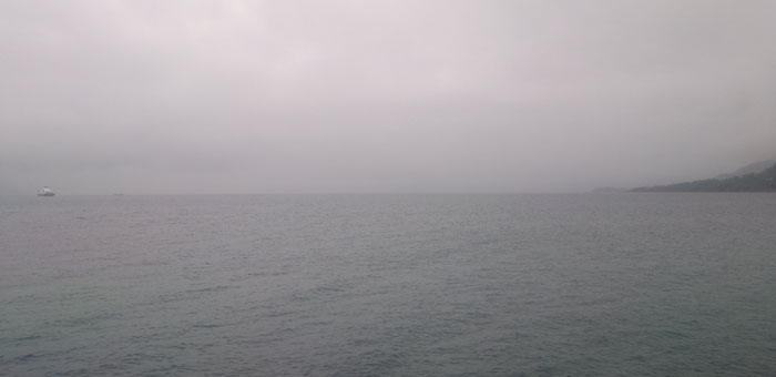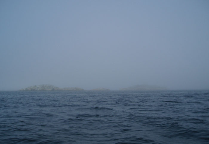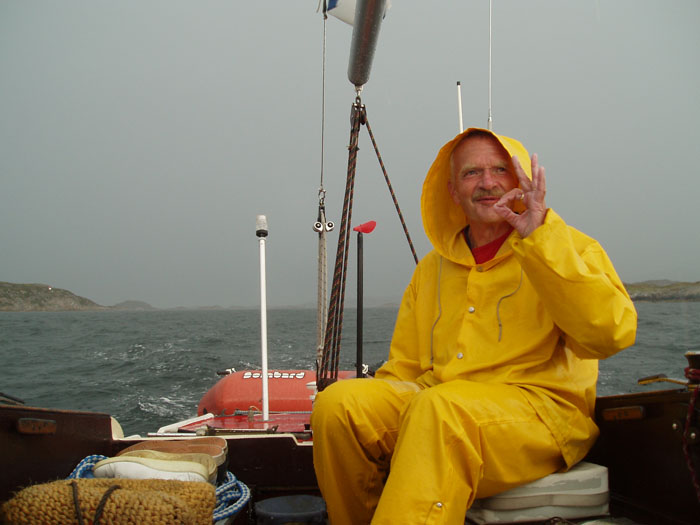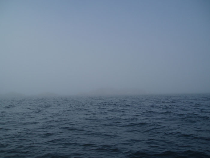 Heinäkuun loppupuolella olimme päässeet Leirvikiin (59°46 N) asti. Norjan säätiedoitukset olivat varoittaneet kovista rankkasateista ja tulvavaarasta. Ja vettähän me saimme oikein saavikaupalla. Kolme päivää jouduimme sielläkin odottelemaan sään selkenemistä. Vihdoin näytti siltä, että maailma hieman kuivuisi ympärillämme. Lähdimme puolenpäivän jälkeen. Aurinko paistoi, eikä tuulikaan ollut pahanlainen. Mutta noin tunnin ajon jälkeen maista päin vyöryi sumu. Kolmen päivän sateiden kosteus siellä alkoi haihtua ilmaan. Lopulta sukelsimme itse sumuun. Näkyvyys oli paikoin 300 - 400 metriä ja yläpuolellamme näkyi sininen taivas! Tutkalle ja karttaplotterille tuli todellista käyttöä. Rantoja tai karikoita ei näkynyt, ainoastaan valkeat tyrskyt sumun seasta, kun mainigit iskeytyivät niihin. Vaaratilanteen aiheutti vastaantuleva ”muskelivene”, joka ajoi aivan liian suurta nopeutta sääolosuhteisiin nähden. Vasta viime hetkellä muutaman sadan metrin päässä meistä, se oikaisi kurssiaan meidän ohi. Iltakuudelta Haugesundia (59°24 N) ohittaessamme sumuverho vihdoin väistyi kokonaan. Oli sillekin päivälle ollut jännitystä aivan tarpeeksi.
