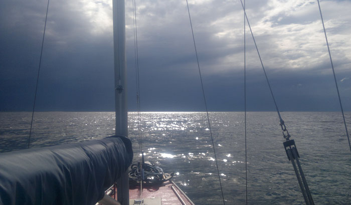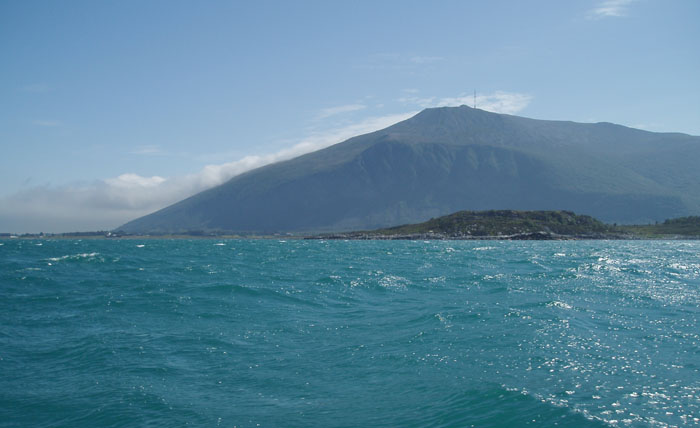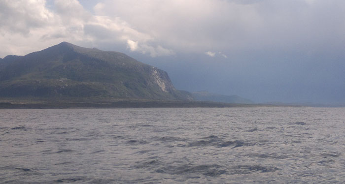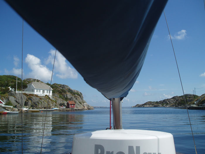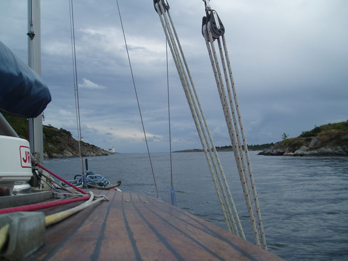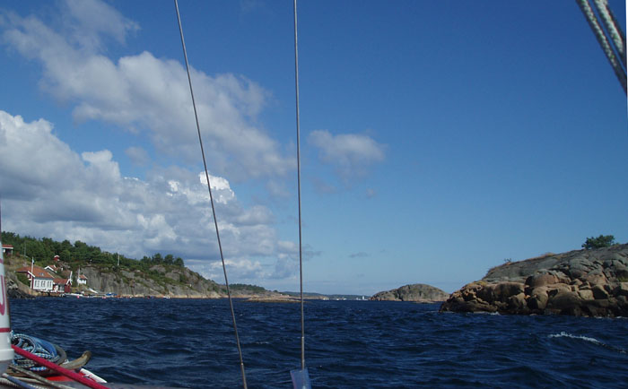 Heinäkuun alussa olimme odotelleet Kristiansundissa kolme yötä saderintaman ja pohjoistuulen asettumista, jotta voisimme ylittää Hustadvikan aukon. Jonkunnäköinen vire oli edelleen pohjoisenpuolelta, joten emme heti suunnanneet ulkokautta, vaan kiersimme sisäreittiä, jotta aavan osuus olisi lyhempi. Sitä kautta muutkin purjeveneet tuntuivat kulkevan. Iltapäivällä viiden aikaan sisäreitti oli läpikäyty ja tulimme ulos aavalle merelle. Maininki oli edelleen korkeaa. Näimme jo kaukaa vastaantulevien purjeveneiden heiluvan sivuttaismainingissa. Mainingin lisäksi Hustadvikan laivareitti kulkee kapeikkojen ohi, missä matalat petolliset luodot ja karikot avaavat mainingin pärskeiksi. Vasta useamman tunnin jälkeen pääsimme uloimman niemen ohi ja käänsimme kohti eteläkaakkoa, jolloin alkoi helpottaa. Koko päivän vallinneesta kirkkaasta auringonpaisteesta sen sijaan ei oikein jäänyt mielikuvaa...
