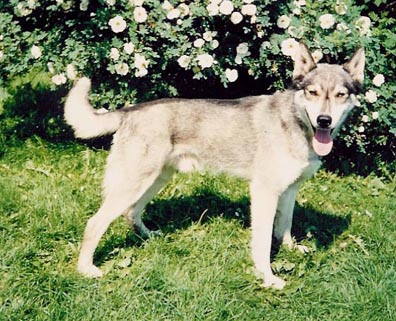Kookas, kevytrakenteinen, jalkava koira. Ruskeanharmaa sudenväri, ruskeat